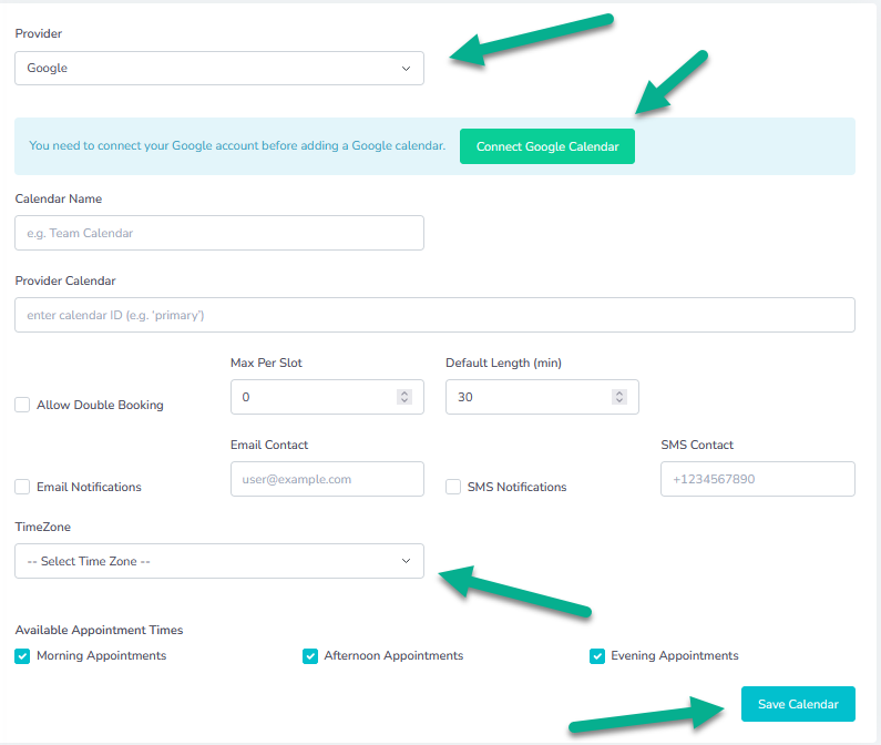 Connect your calendar by clicking on the green Connect Google or Outlook Calendar button.